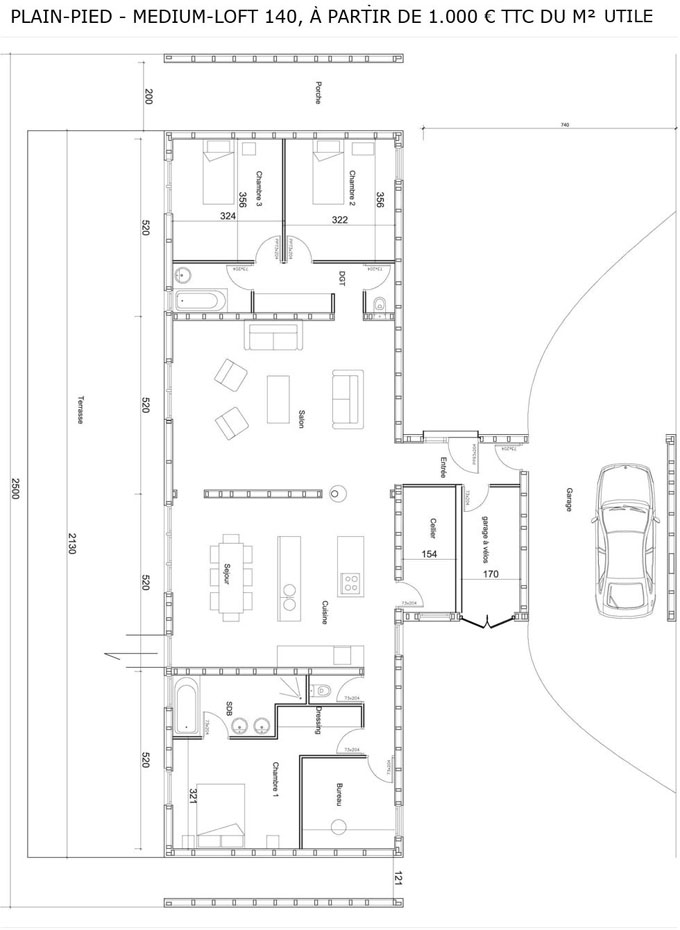 Exemple : une maison de 80 m2 habitables, de 18 m2 de garage et 15 m2 de auvent couvert ou terrasse = 2 264,00 € TTC (80 x 25€ + 18 x 8€ + 15 x 8€)